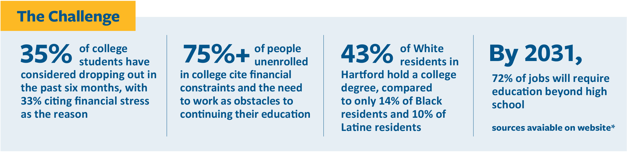 Over the past 50 years, college tuition has tripled, placing higher education further out of reach for many young, talented scholars in our community, shutting doors on opportunity before they even get a chance to step through. Beyond the financial burden, students face an array of other challenges, forcing many to forgo college, drop out, or graduate with life-altering debt.